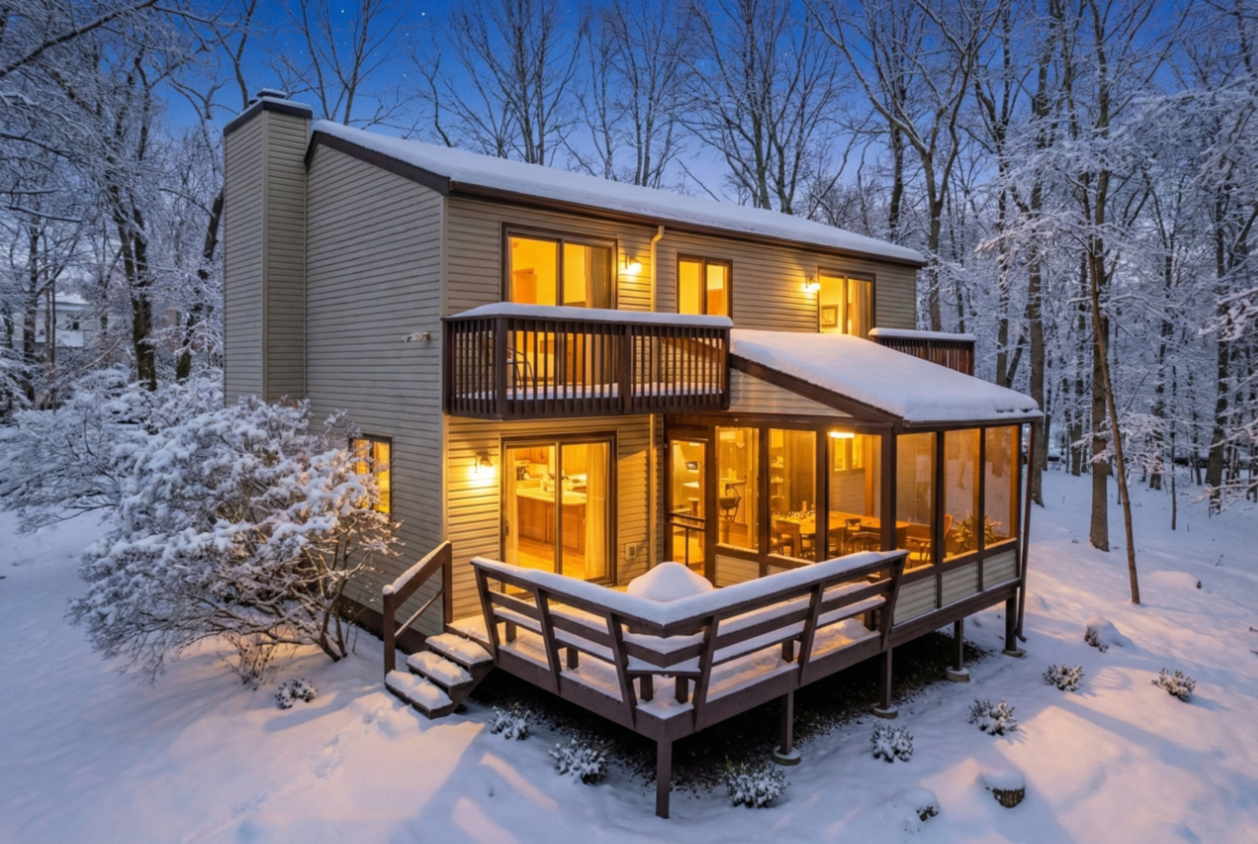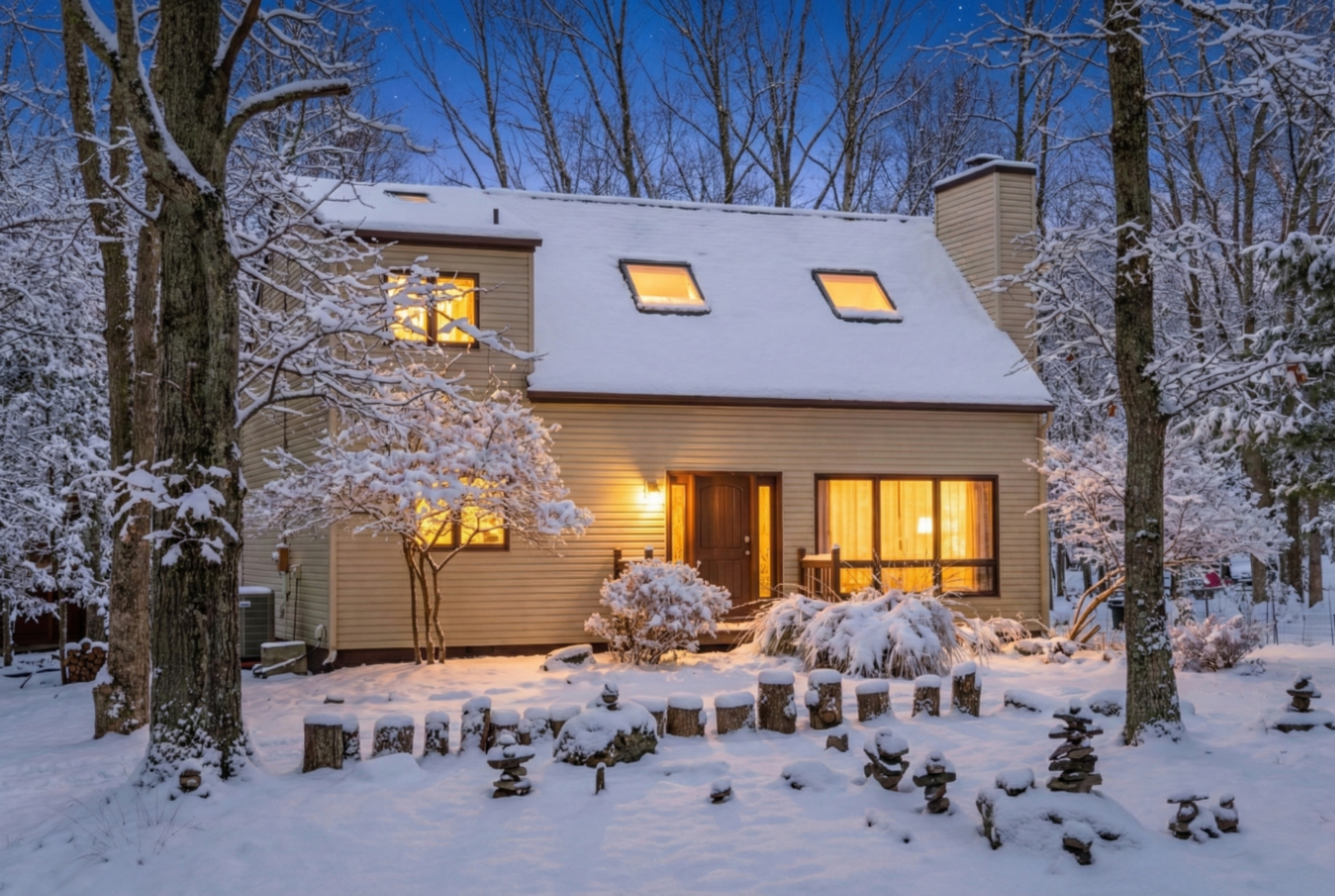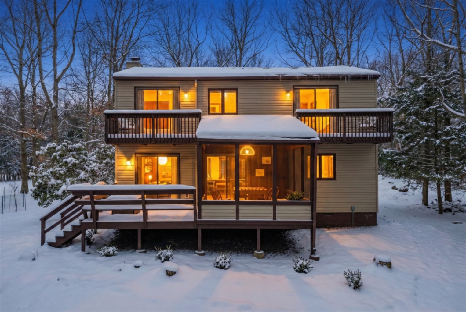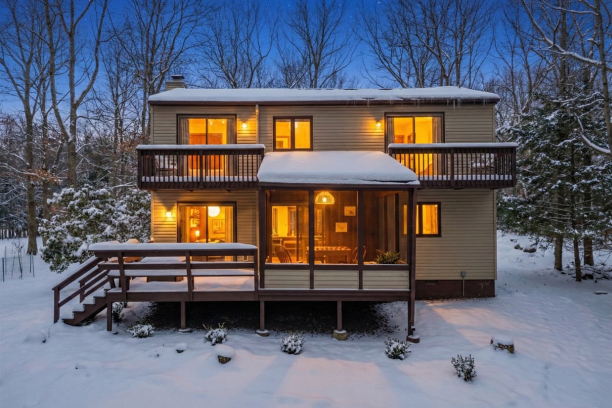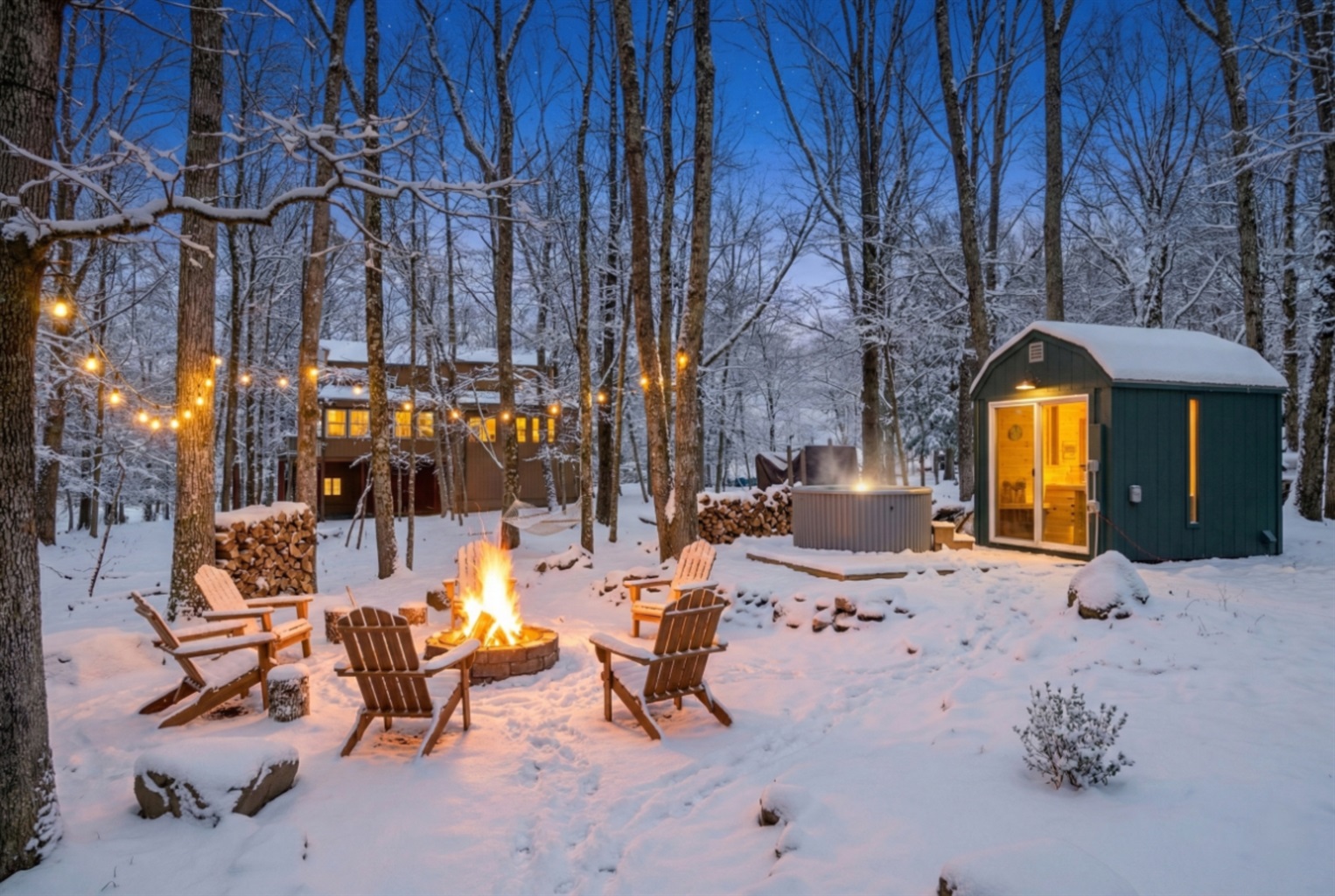3 Bedrooms • 2 Bathrooms 2 Baths • Sleeps 3-6Relax and unwind at this stunning Poconos vacation property. Melt your troubles away with a dip in the hot tub or experience our custom-built Finnish-style sauna. This property has been thoughtfully remodeled throughout with warm wood floors, hand crafted ceramic tiles, extra comfortable beds, and custom artistic details, creating a truly unique and luxurious feel. Relax in the spa-like bathroom, sit by the firepit, or enjoy the lakes, pools, tennis courts or other amenities in the community.
