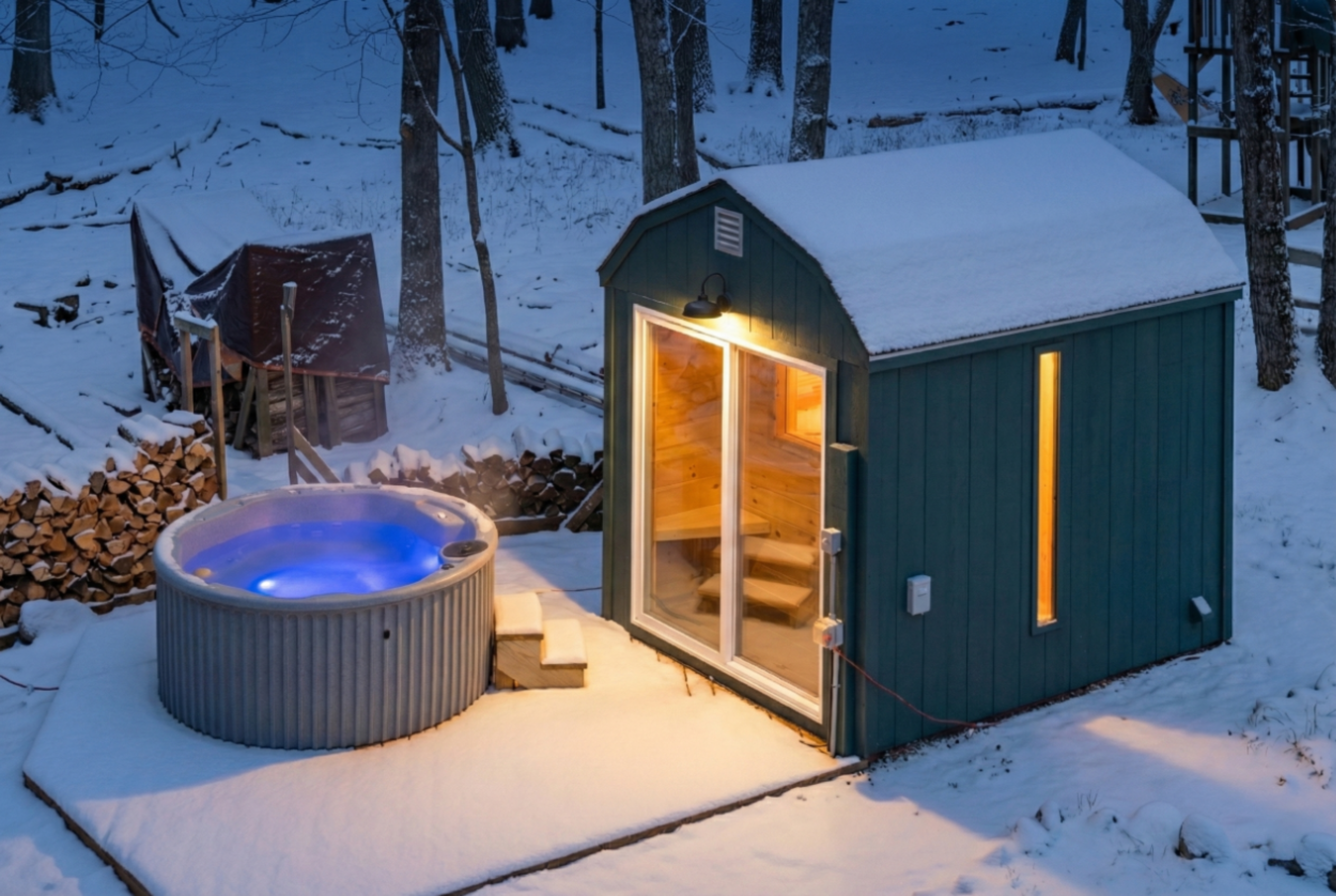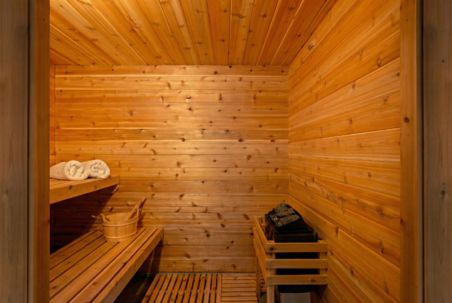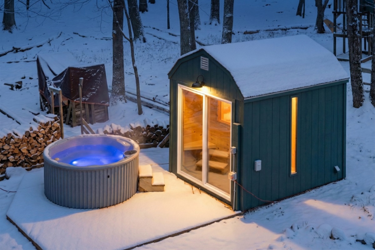 Highlights of the yard also include a circular 4-person hot tub, a changing room, and a Finnish sauna - the sauna is a true Finnish-style experience, with cedar-lined walls and benches, a Turku brand heater with rocks, and a wooden bucket and ladle to create steam (Löyly).